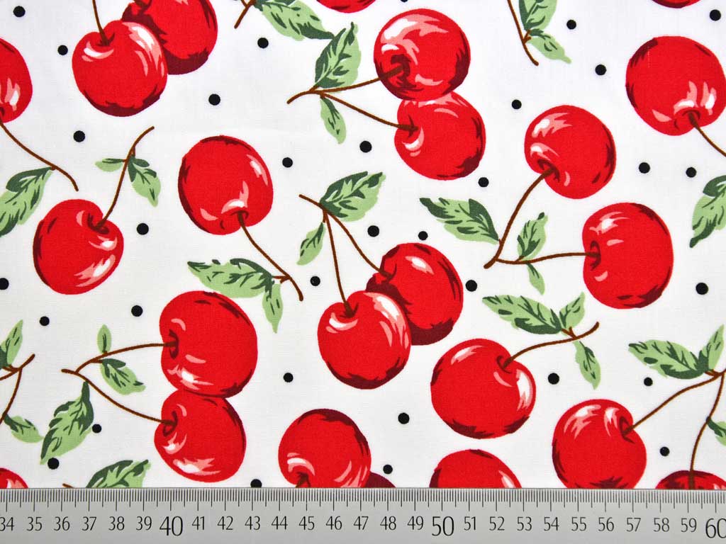 Ein Baumwollstoff in weiß mit knackigen roten Kirschen und grünen Blättern.