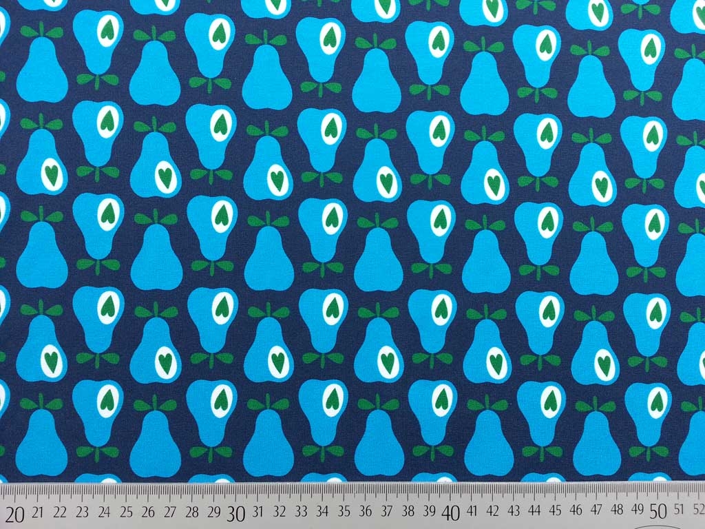 Ein dunkelblauer Baumwollpopelin von der Hamburger Liebe aus der Serie Simply Pears mit cyanblauen Äpfeln und grünen Blättern, Stengeln und Herzen.