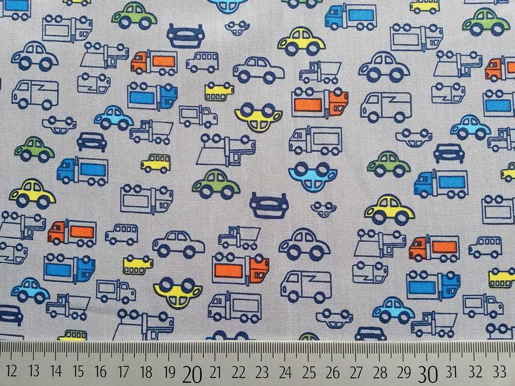 Ein toller Baumwollstoff in dunkelgrau bedruckt mit kleinen Autos und Laster in dunkelblau, orange, hellgrün und blau.