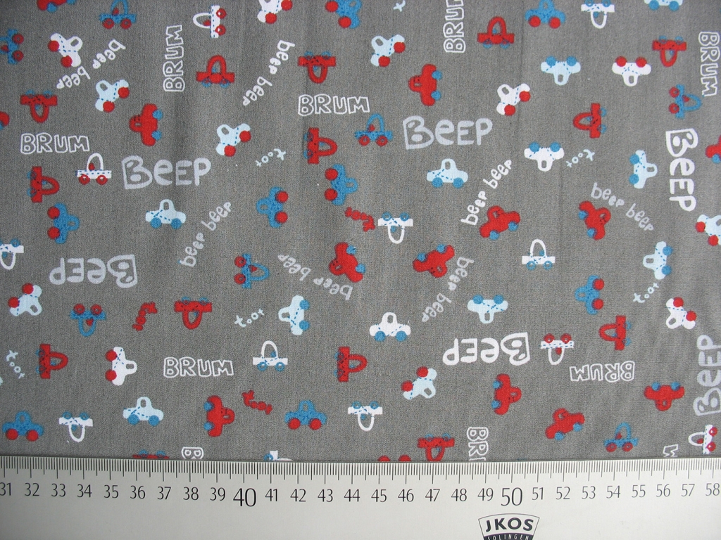 Ein zuckersüßer Jungenstoff mit roten, weißen und hellblauen Autos auf dunkelgrauem Grund.