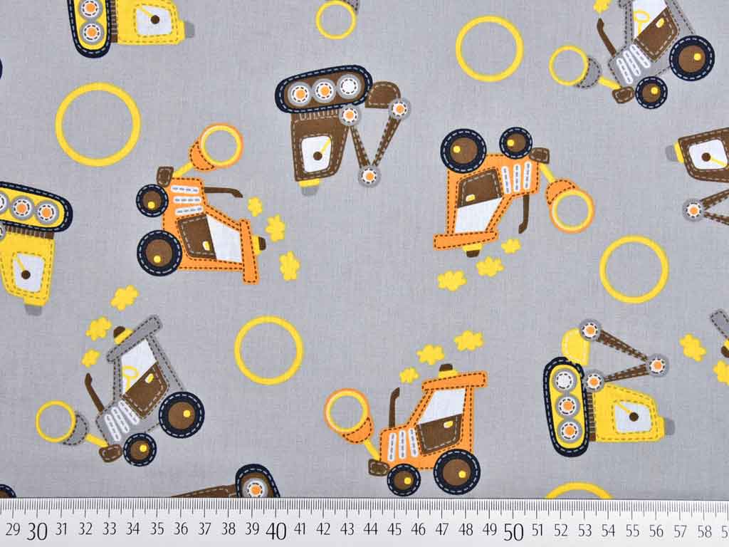 Ein glatter grauer Baumwollstoff mit Baustellenfahrzeugen in gelb und orange.