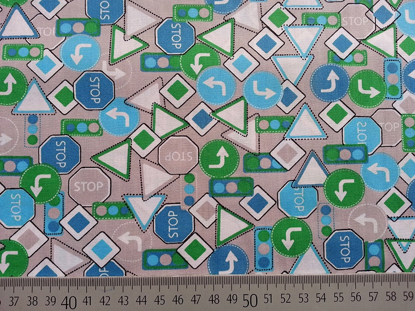 Ein wunderschöner Baumwollstoff mit grünen und blauen Straßenschildern auf grauem Grund.