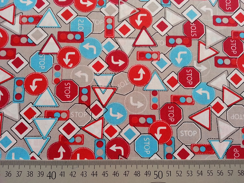 Ein wunderschöner Baumwollstoff mit roten und blauen Straßenschildern auf grauem Grund.