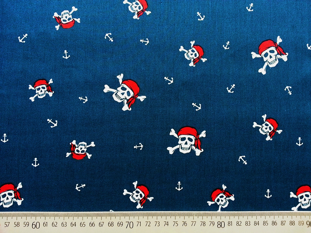 Ein toller Popelin aus Baumwolle in dunkelblau bedruckt mit Totentöpfen und Ankern in weiß.