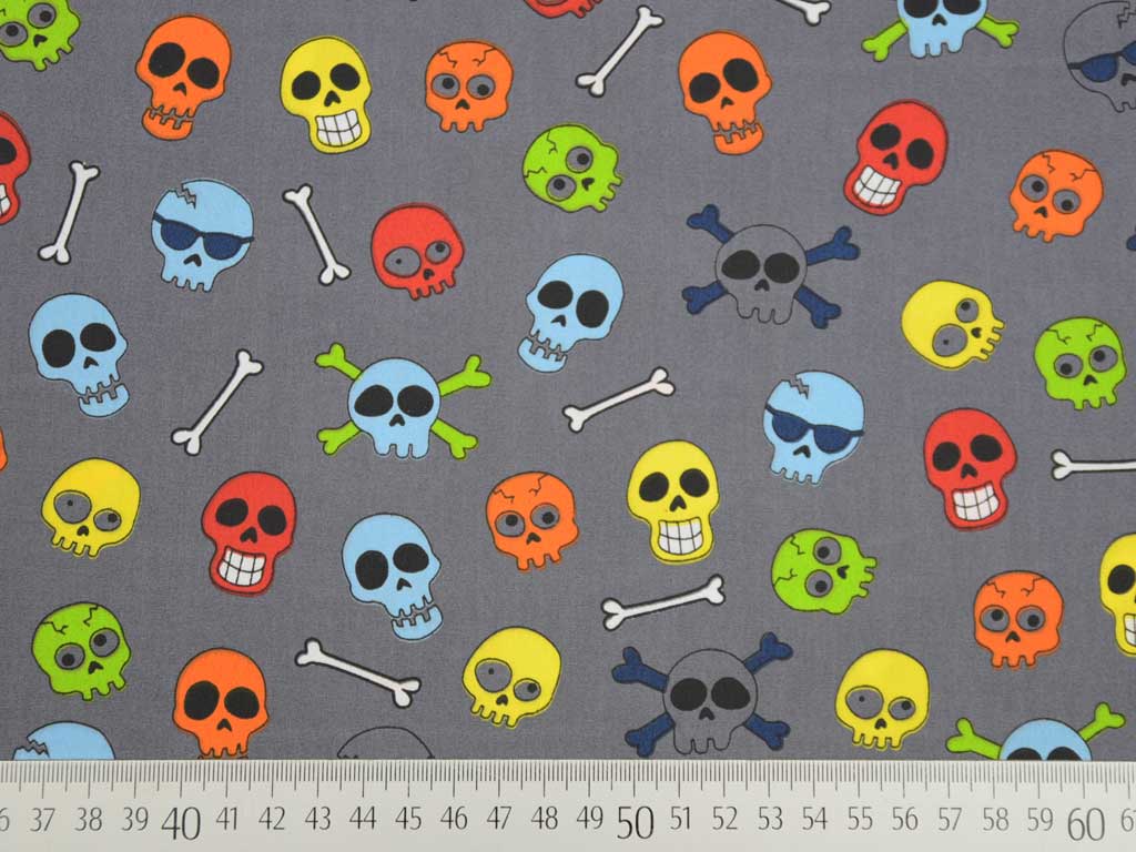 Ein weicher, glatter Baumwollstoff in dunkelgrau mit Totenköpfen und Knochen in hellblau, gelb, orange und rot.