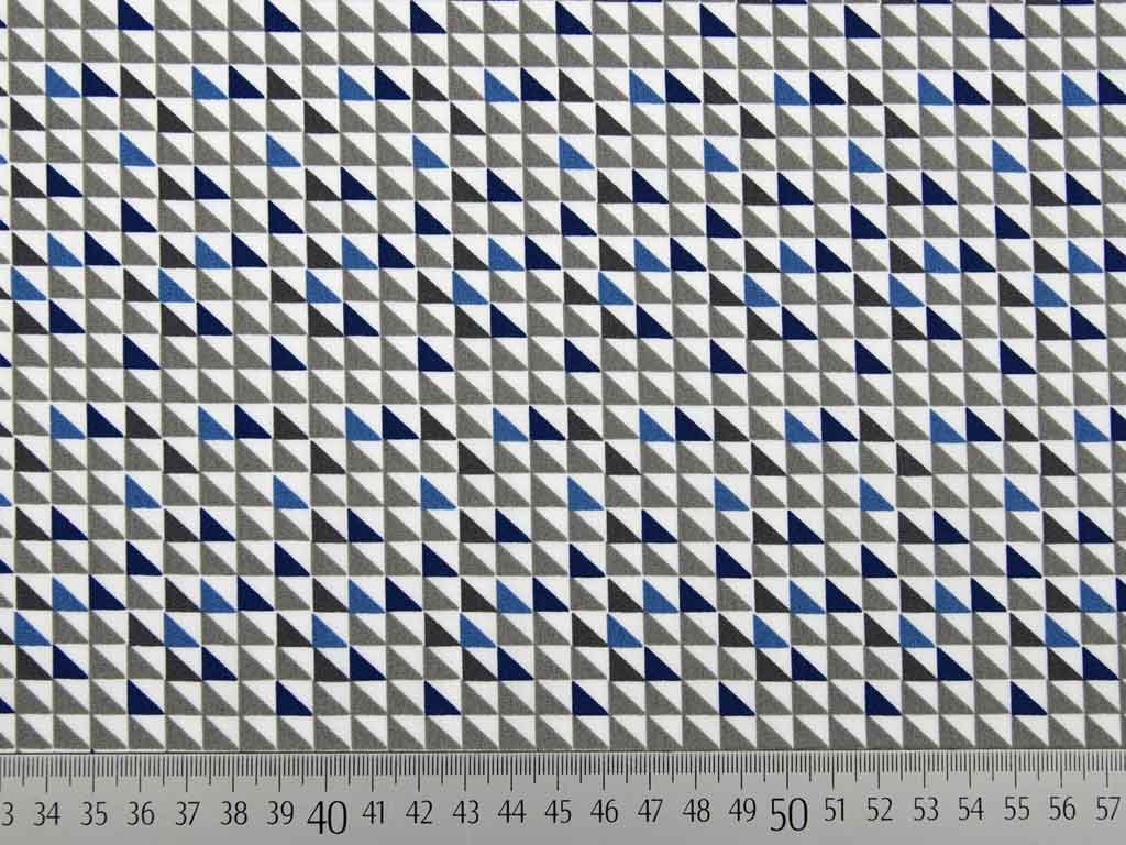 Ein toller Baumwollpopelin in weiß mit kleinen Dreiecken in jeansblau, hellgrau und dunkelgrau.
