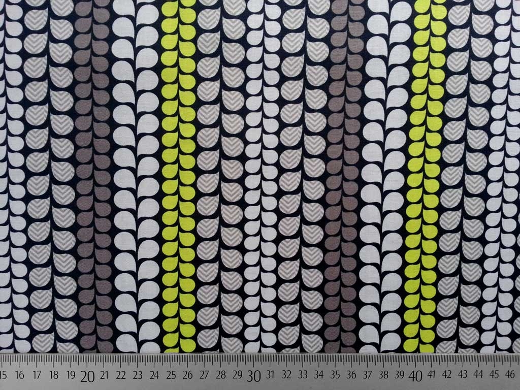 Ein wunderschöner, weicher Baumwollstoff von Camelot in dunkelblau mit stilisierten Blättern als Bordüre in limette , dunkelgrau, weiß und hellgrau-gemustert.