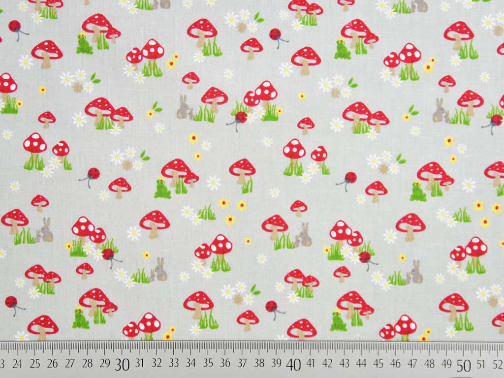 Ein süßer, grauer Popelin Baumwollstoff mit roten Pilzen, weißen und gelben Blümchen und kleinen versteckten Tieren.