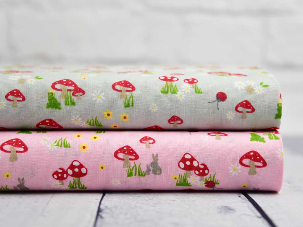 Ein süßer, rosa Popelin Baumwollstoff mit roten Pilzen, weißen und gelben Blümchen und kleinen versteckten Tieren.