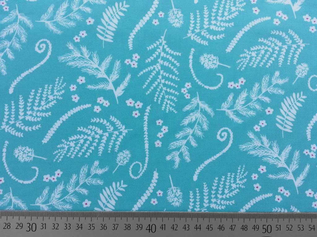 Ein wunderschöner Baumwollstoff in helltürkis mit weißen Ranken, Blättern und kleinen Blümchen.