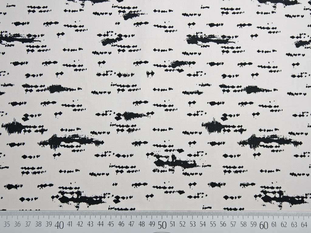 Ein beiger Baumwollsatin mit Elasthan von Milliblu's aus dem Program Wild Things mit schwarzen Pinselstrichen und Farbklecksen. Aufgrund des Elasthananteils dehnt sich der Stoff und bietet hohen Tragekomfort.