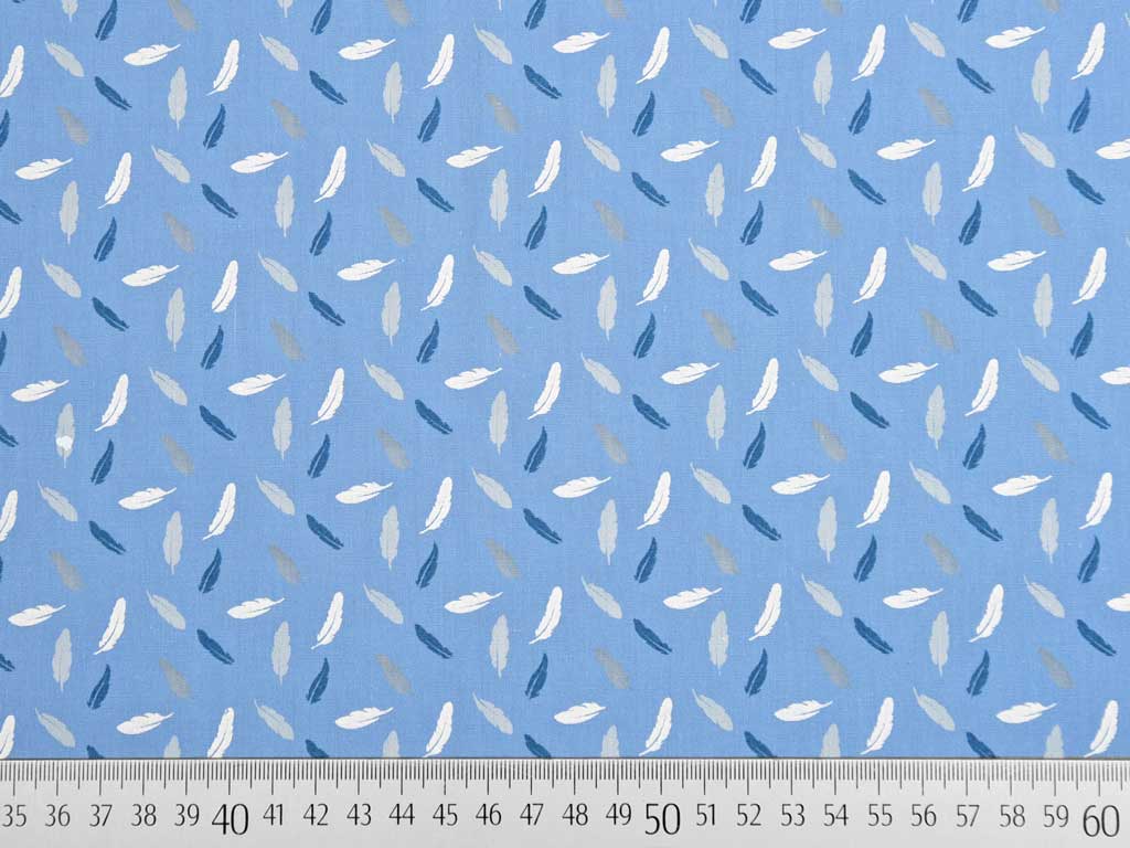 Ein schöner Baumwollstoff (Popelin) in rauchblau mit kleinen Federn in weiß, grau und dunkelblau.