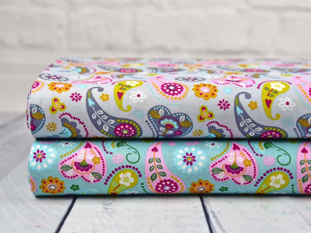 Ein hellgrauer, weicher Baumwollstoff mt einem filigranten floralen Muster. Der Stoff ist bedruckt mit beerefarbenen, ocker und rosa Muster im leichten Paisley Stil.