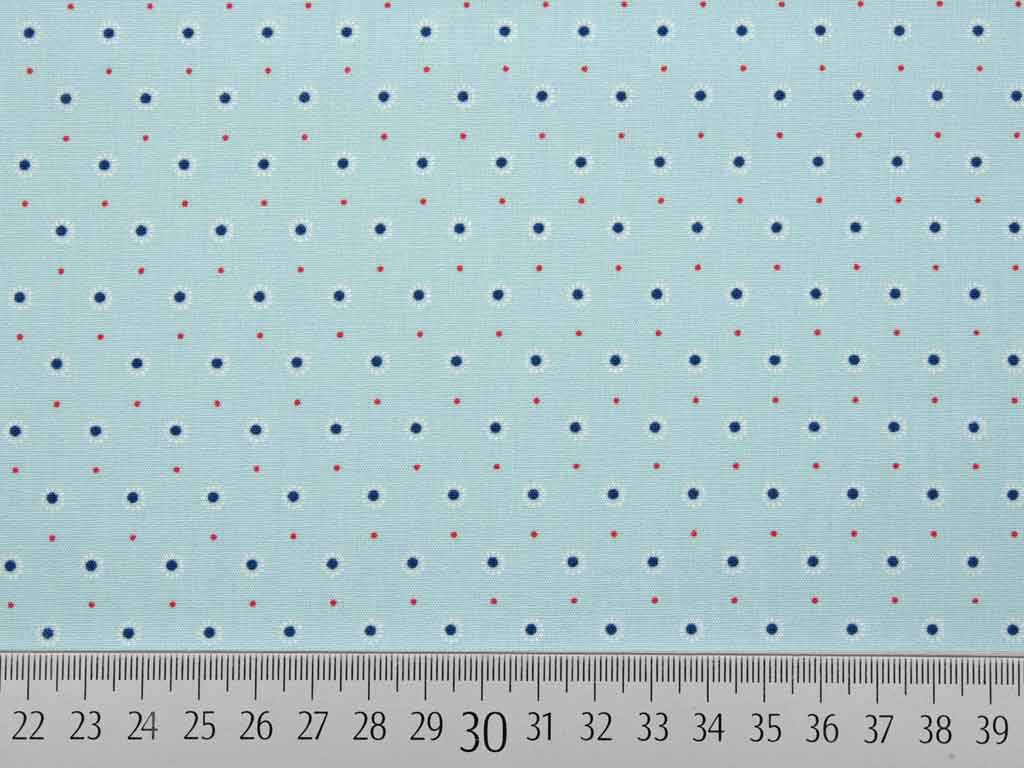 Ein glatter, weicher Baumwollstoff von Poppy aus der Kollektion "Feeling like Spring" in mint mit Blümchen in petrol und weiß sowie roten Pünktchen.