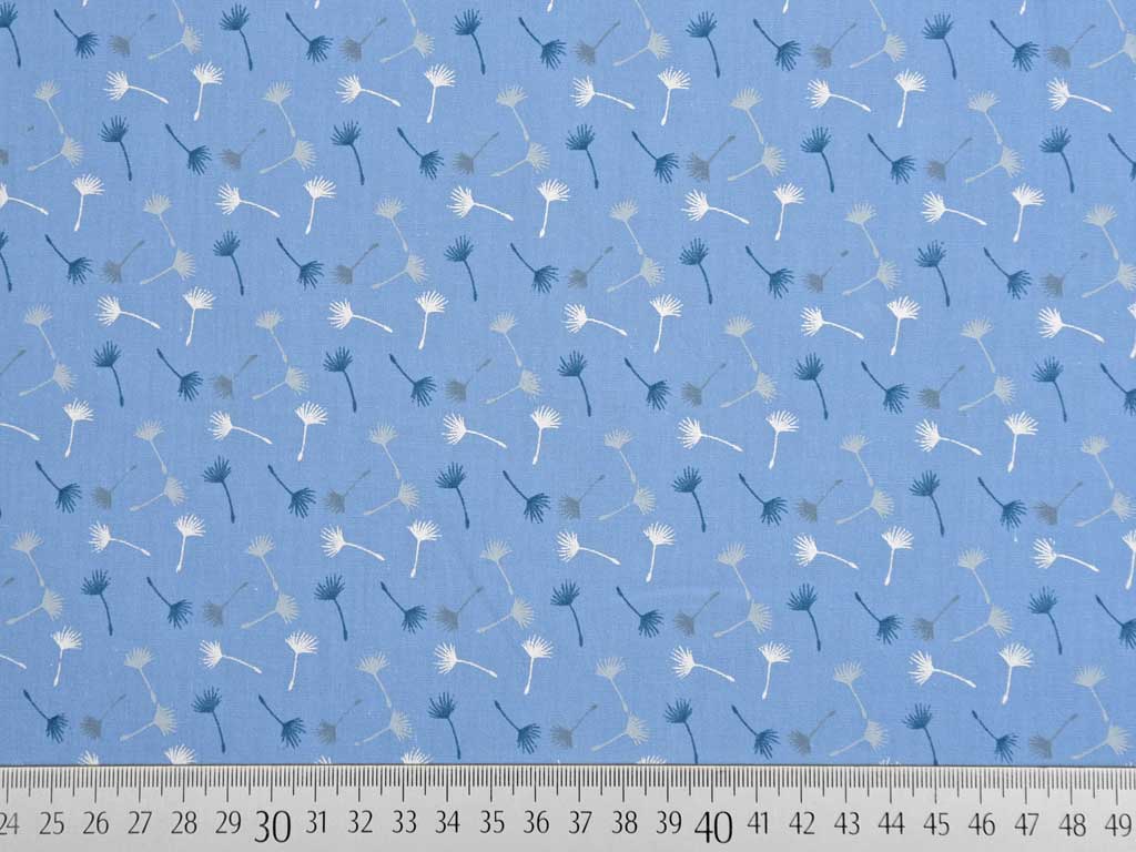 Ein schöner Baumwollstoff (Popelin) in rauchblau mit filigranen Pusteblumen in weiß, grau, dunkelblau.
