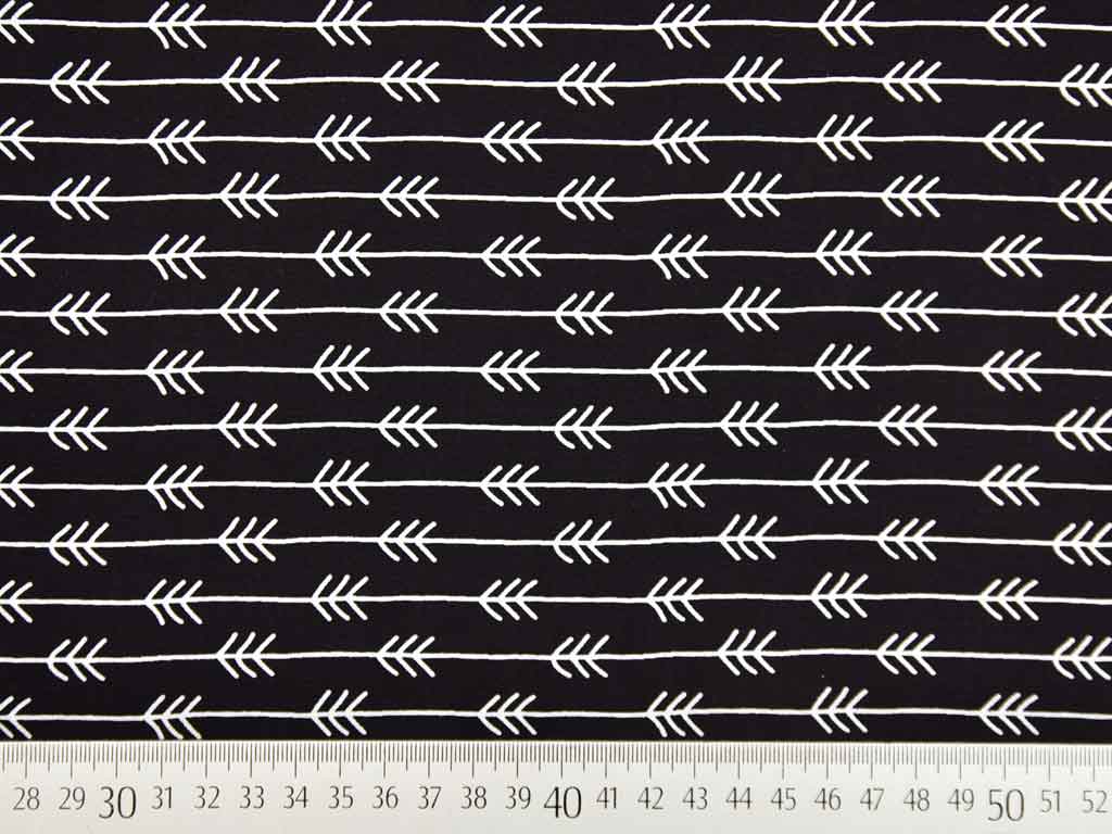 Ein glatter, schwarzer Baumwollstoff (Popelin) mit weißen Linien und Pfeilen.