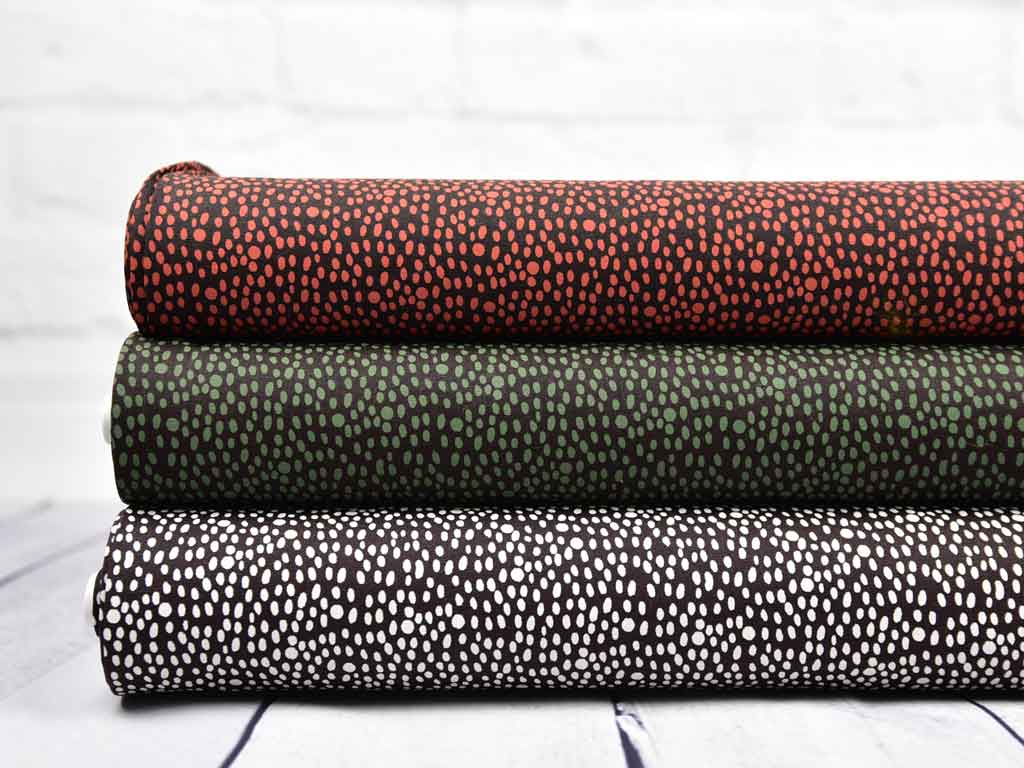 Ein weicher Baumwollstoff in dunkelbraun mit kleinen Tropfen in khaki.