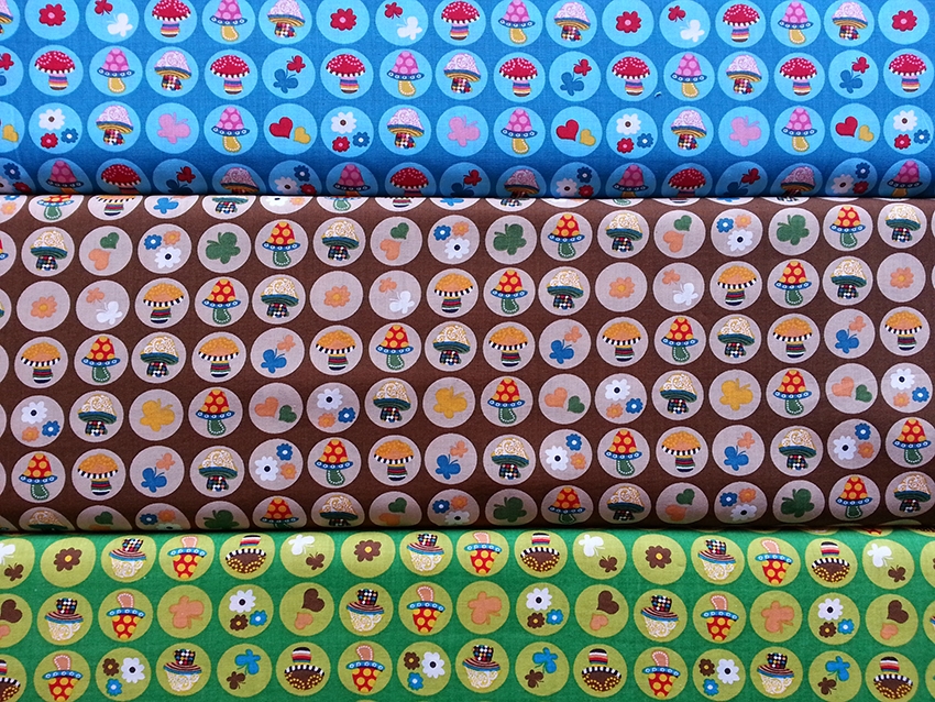 Ein wunderschöner Baumwollstoff in grün mit Kreisen in hellgrün mit niedlichen Pilzen, Herzen und Blumen.