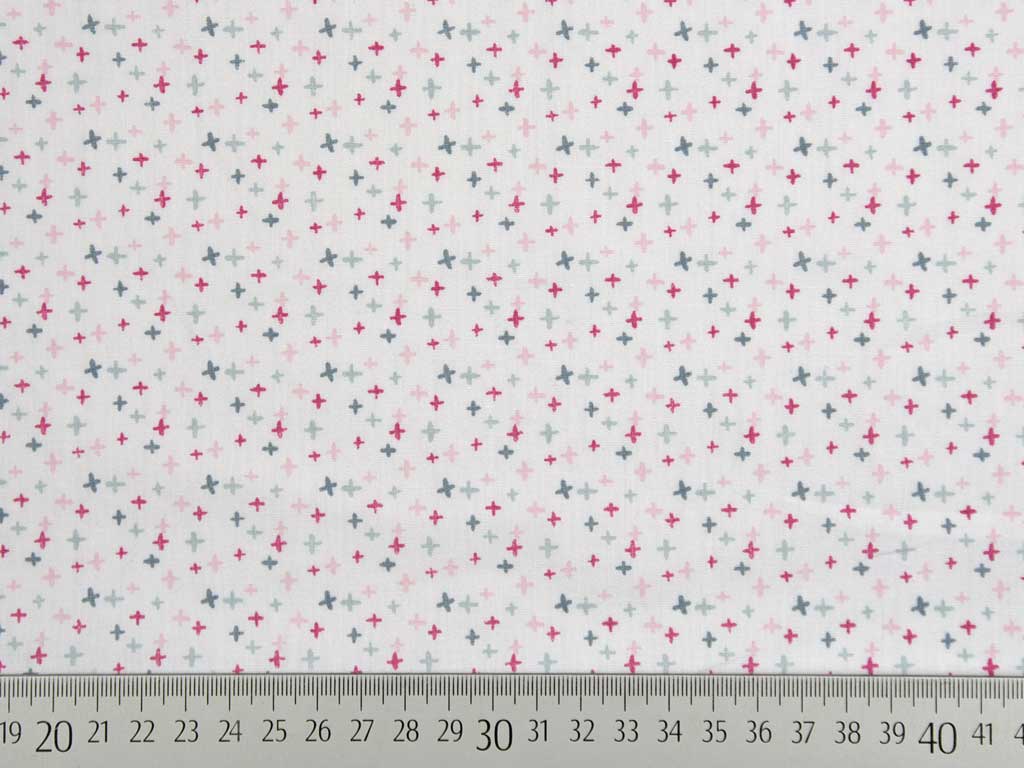 Ein schöner Baumwollstoff (Popelin) in weiß mit kleinen, filigranen Kreuzen in altrosa, grau, dunkelrosa.