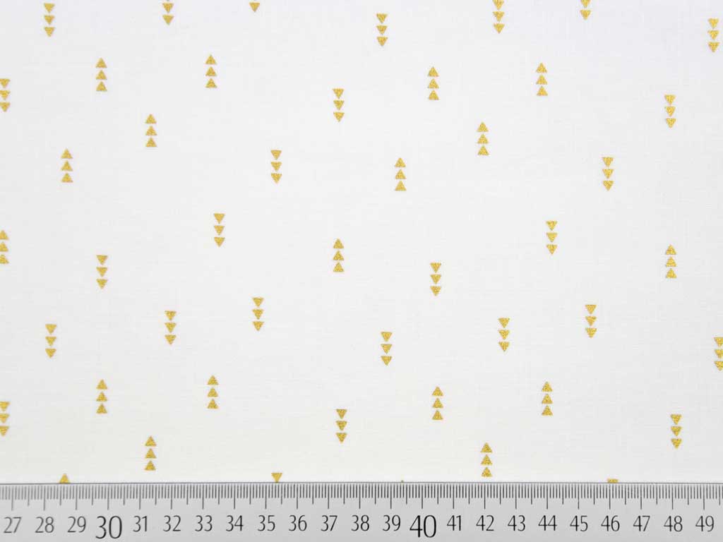 Ein hochwertiger Baumwollstoff vom Camelot Design Studio aus der Kollektion "Mixology Luxe" hier in cremeweiß mit gold-metallic Pfeilmuster bestehend aus 3 kleinen Dreiecken.