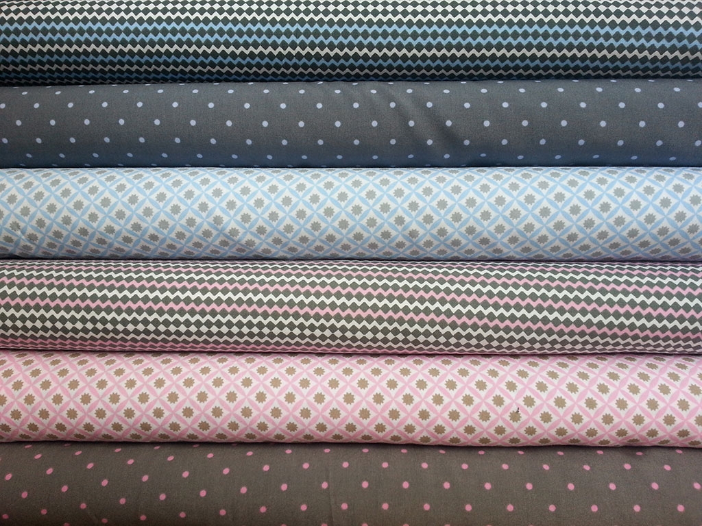 Ein toller Baumwollstoff mit kleinem Zickzackmuster in rosa, weiß und taupe.