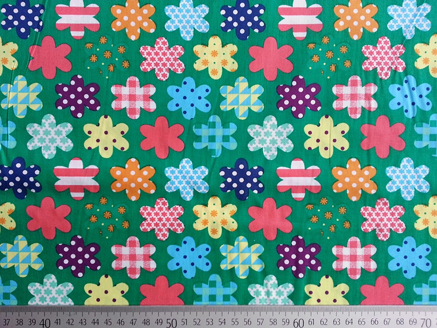 Ein toller Popelin aus Baumwolle bedruckt mit Retroblumen im Patchwork Stil. Der Grundton ist ein kräftiges Grün mit pink (lachs), hellblau, gelb, lila, dunkelblau.