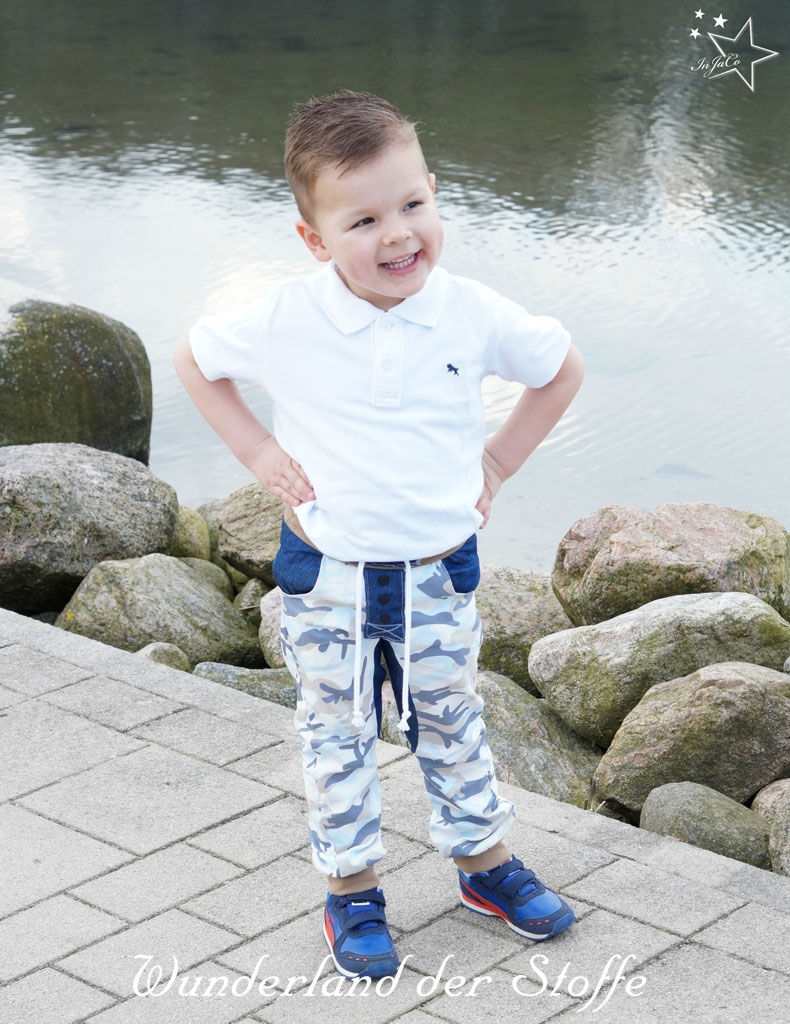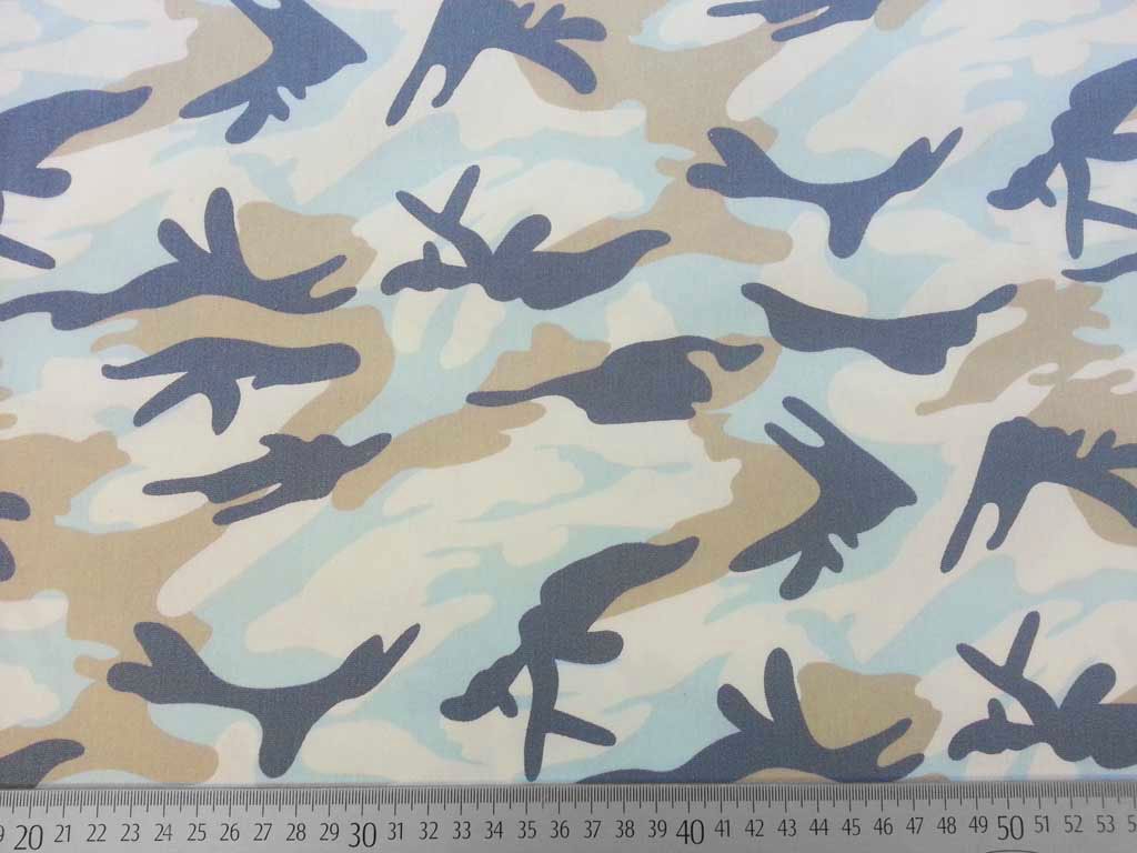 Ein lässiger Baumwollstretchstoff mit Camouflage Muster in beige, hellblau, cremeweiss und dunkelblau.