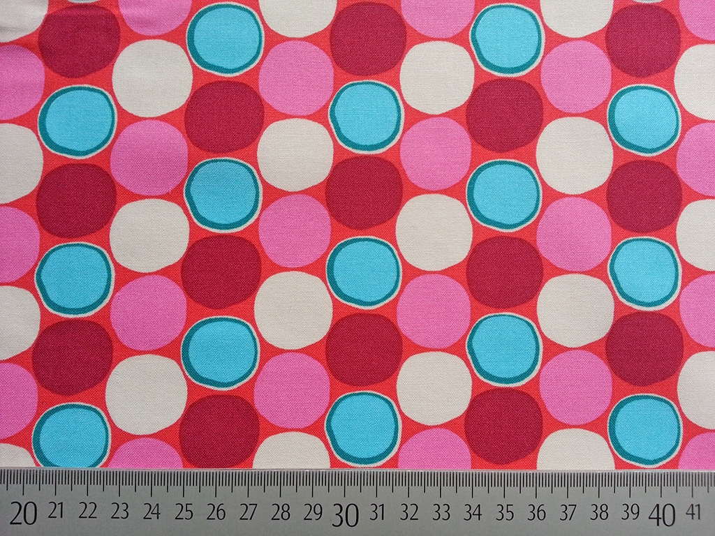 Ein frischer Baumwollstoff in rot mit Punkten in rosa, pink und türkis.