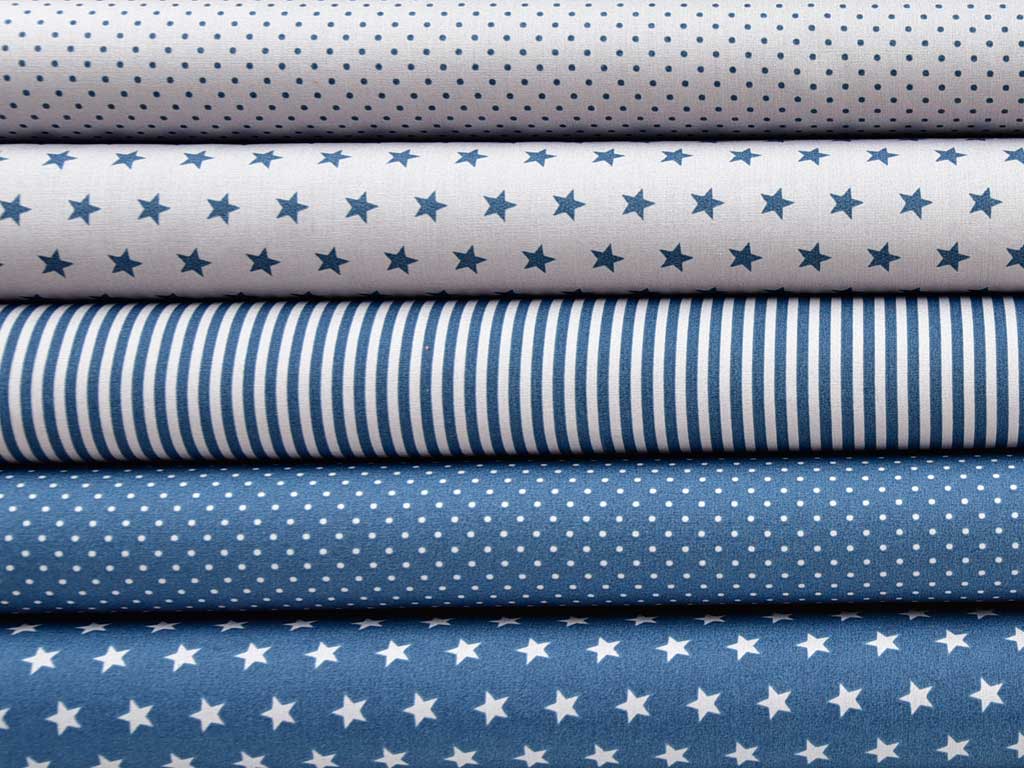 Ein toller Baumwollstoff (Popelin) in hellgrau mit 2 mm großen jeansblauen Punkten.