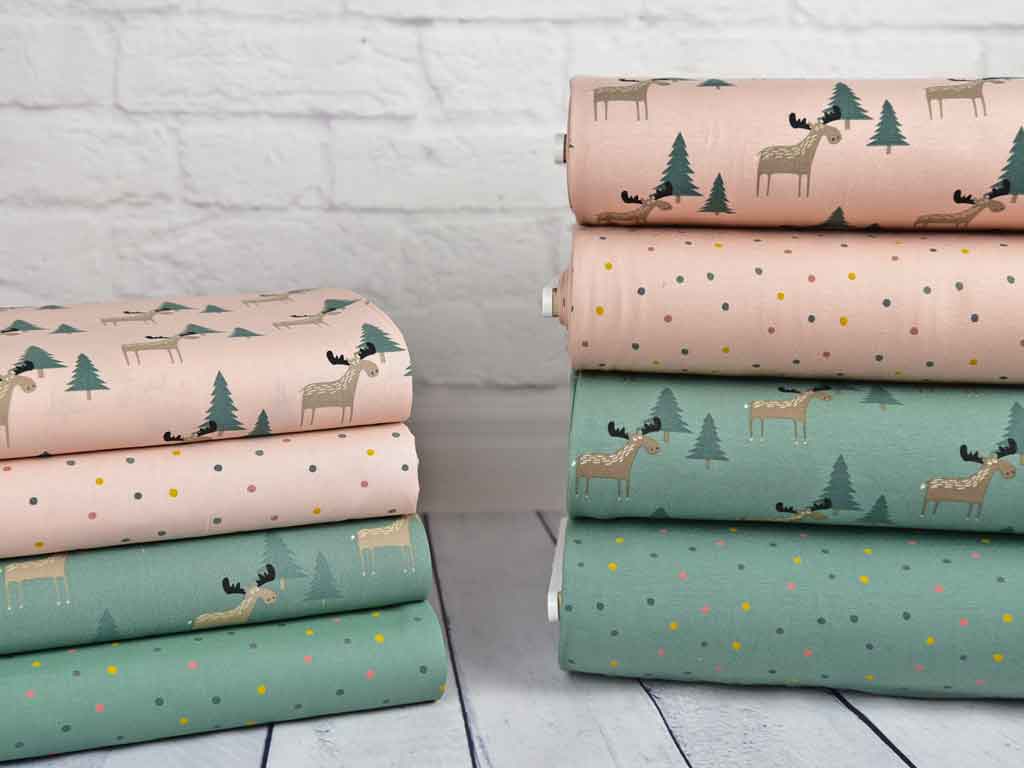 Ein weicher, dunkelgrüner (matt) Baumwollstoff mit leicht unregelmäßigen Punkten in Dunkelgrün, Ockergelb und Altrosa. Die Punkte sind zwischen 3 und 4 mm groß.