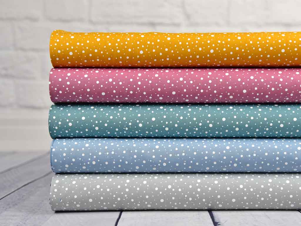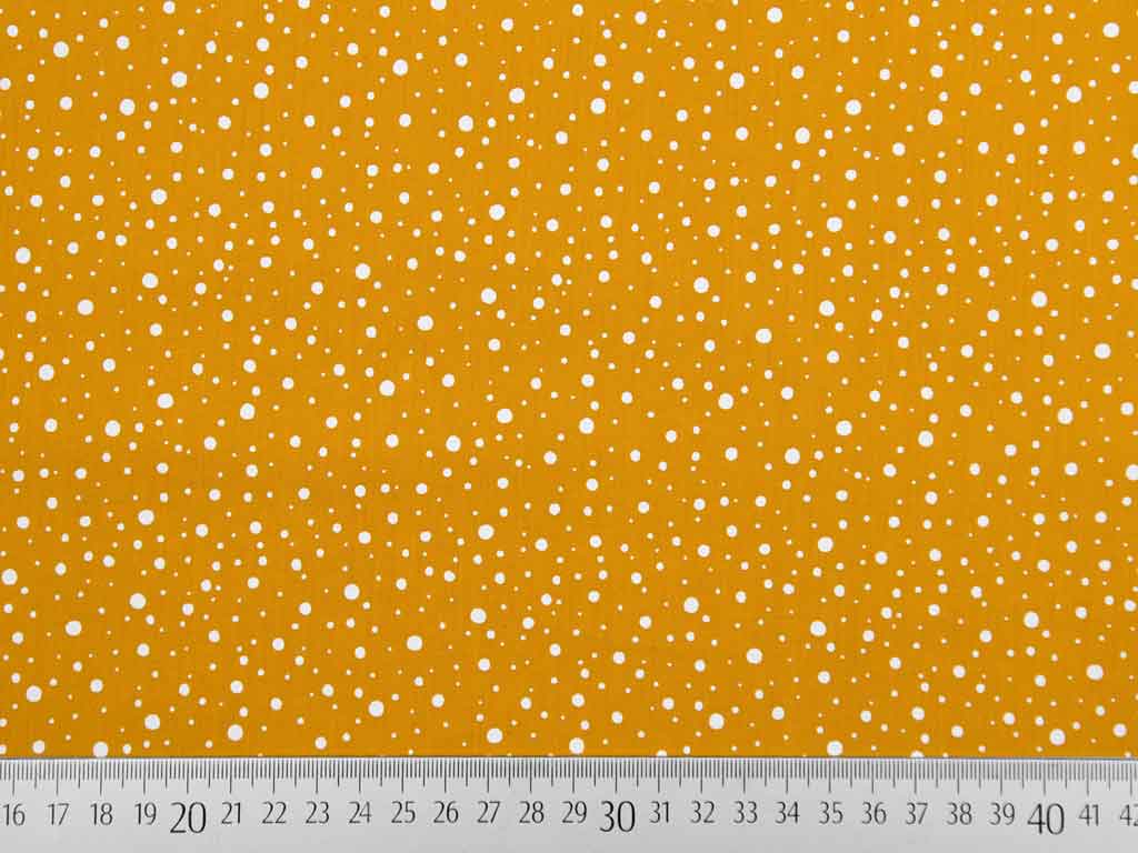 Ein glatter Baumwollstoff (Popelin) in ocker mit verschieden großen, weißen Pünktchen (1mm bis 3mm).