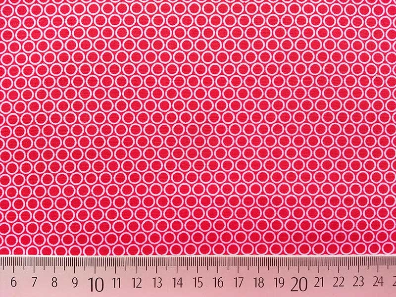 Ein kirschroter Baumwollstoff mit 0,6 cm großen rosa Kringeln/ Punkten.