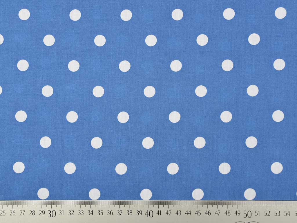 Ein jeansblauer Baumwollstoff mit weißen Punkten. Die Punkte haben einen Durchmesser von ca. 1cm.