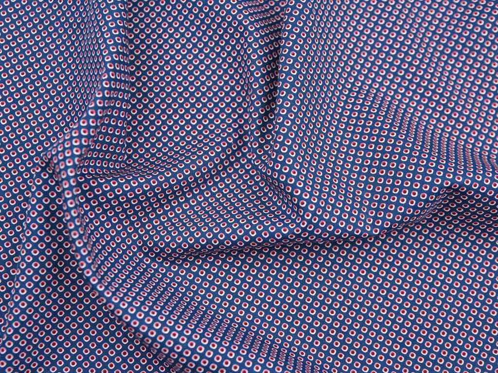 Ein hochwertige Baumwollstoff in dunkelblau mit weinroten Punkten und weißer Umrandung von Editex.