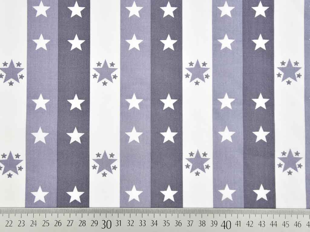 Ein weißer Baumwollstoff aus dem Hause Stenzo bedruckt mit mittelgrauen und dunkelgrauen Streifen sowie weißen und grauen Sternen.