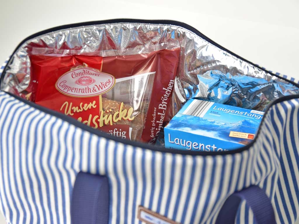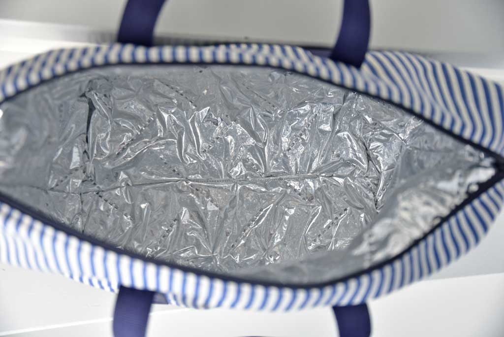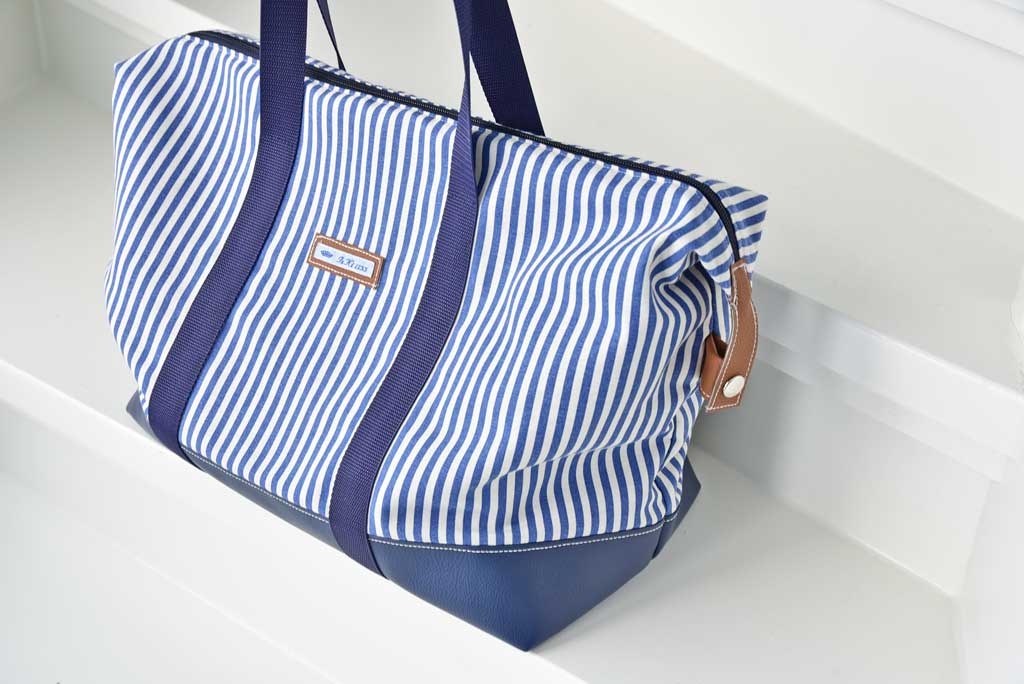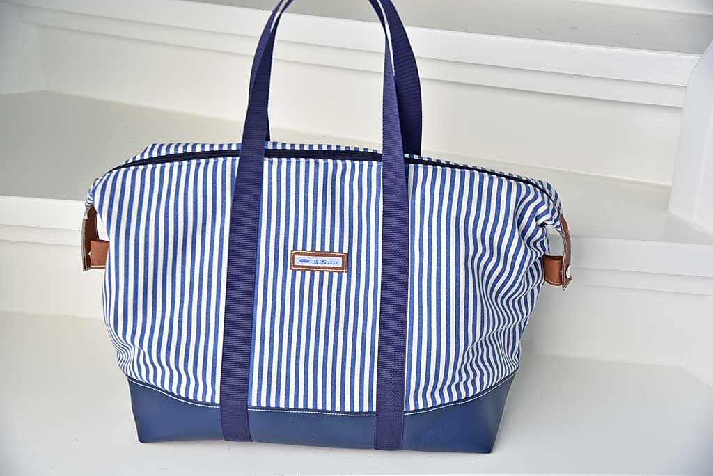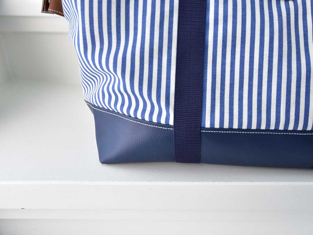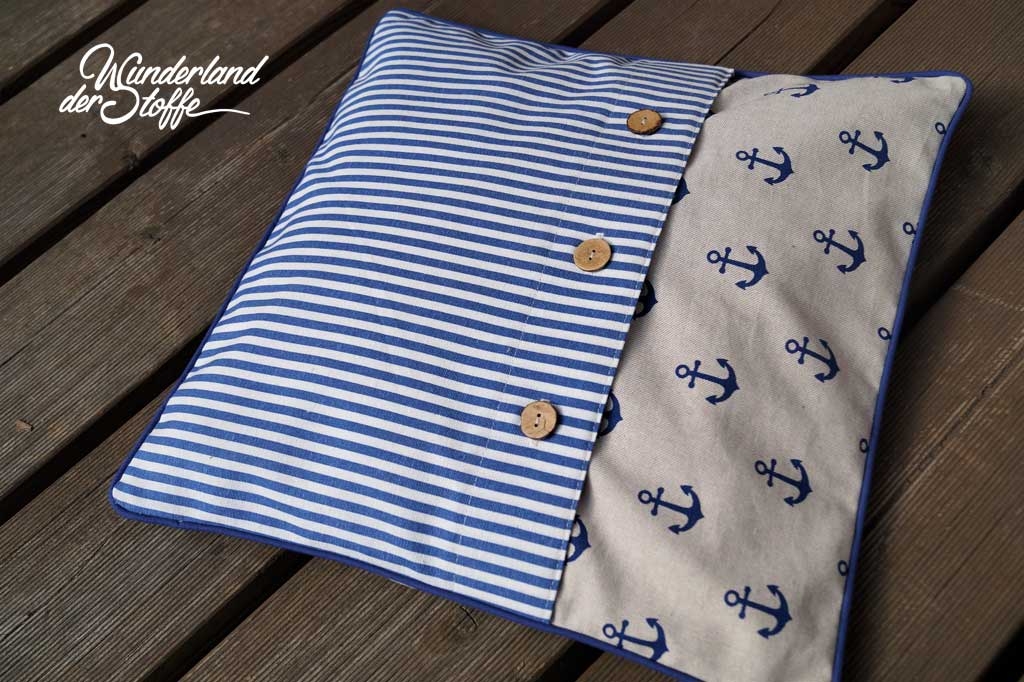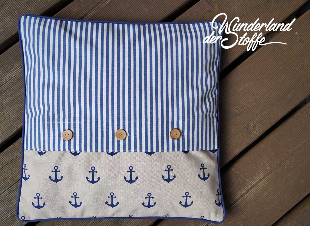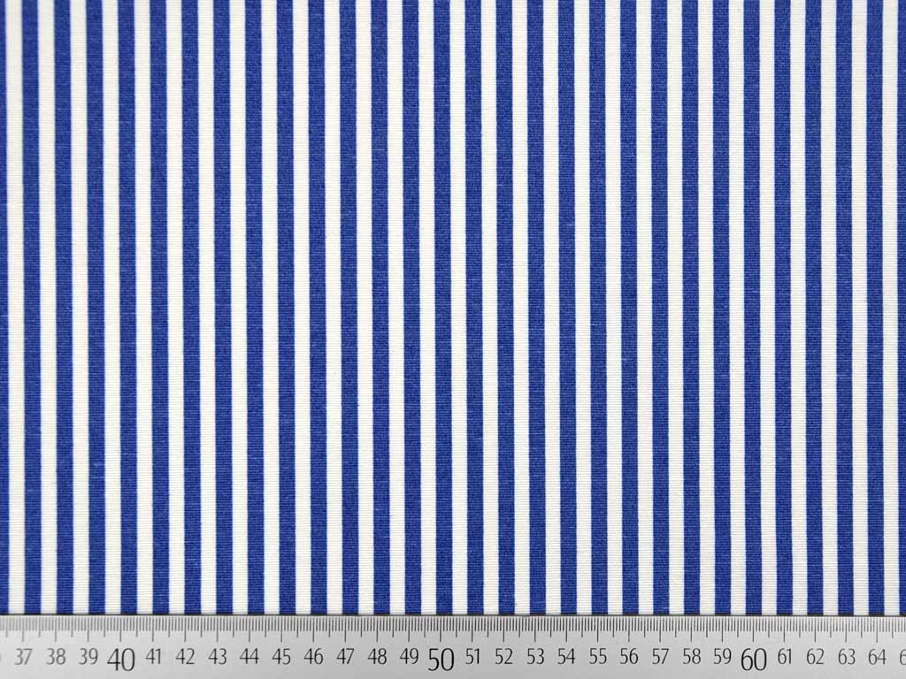 Ein etwas dickerer und festerer Dekostoff mit 5 mm breiten blauen und ecruefarbenen Streifen.