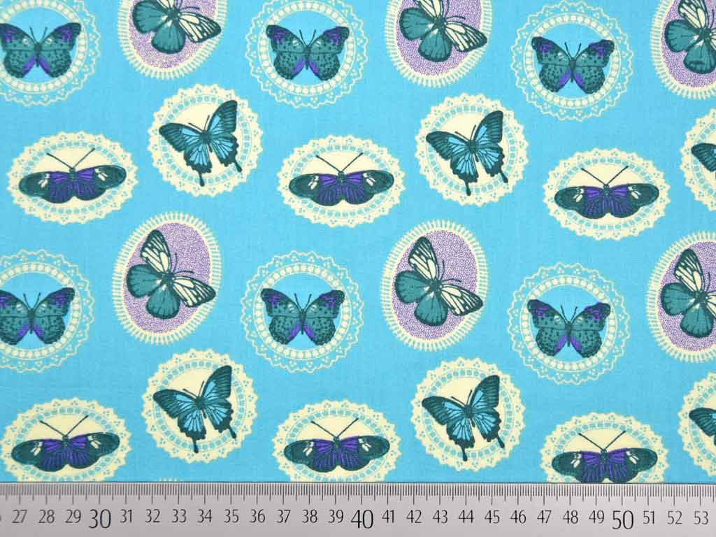 Ein toller Baumwollstoff in mint mit Ornamenten und Schmetterlingen.