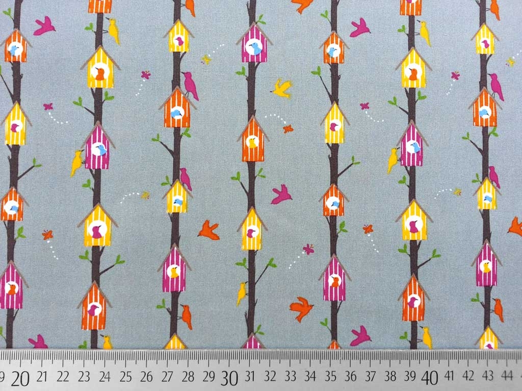 Ein wunderschöner Baumwollstoff in grau mit gestreiften Vogelhäuschen, Ästen, Blättern, Vögeln und Schmetterlingen.