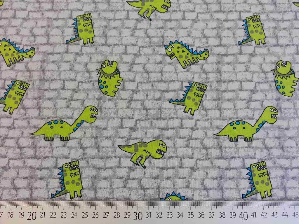 Ein toller Baumwollstoff mit grauem Mauer-Muster mit frechen hellgrünen Dinos und Drachen.