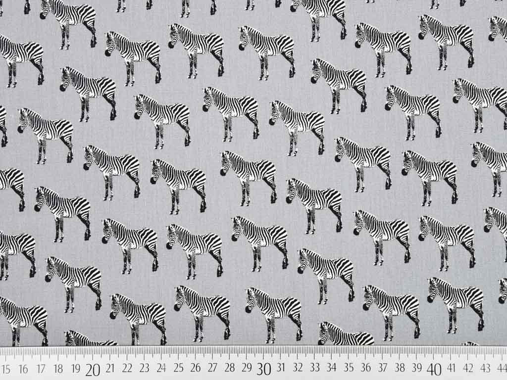 Ein glatter Baumwollstoff in grau mit grafisch angeordneten Zebras.