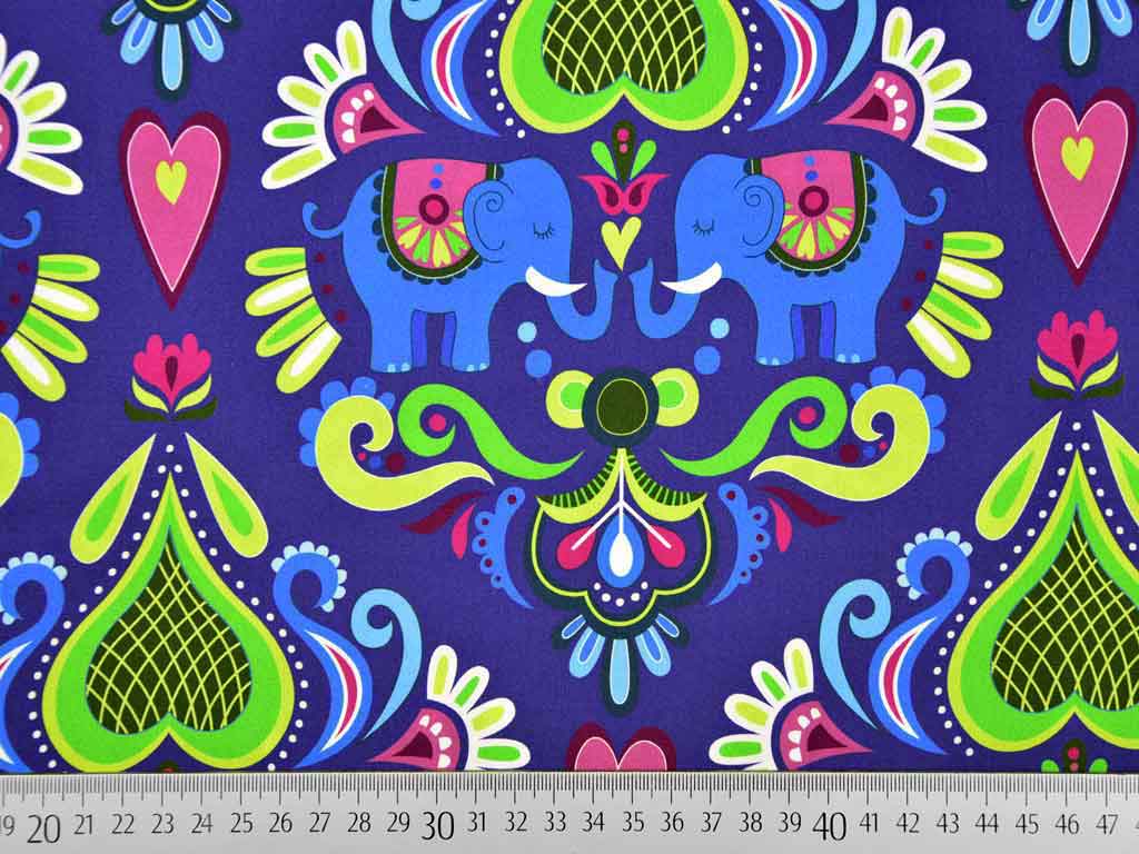 Ein lilablauer Baumwollpopelin von der Hamburger Liebe aus der Serie Elephant Love mit blauen Elefanten, hellgrünen und grasgrünen Ranken, lila und grünen Herzen, blauen und lila Blumen. Produziert von Hilco in bekannt hochwertiger Qualität.