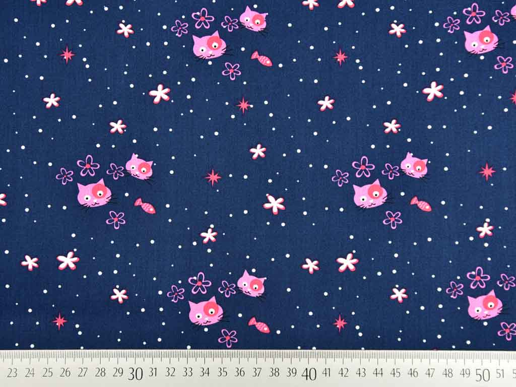 Ein verspielter Baumwollpopelin mit rosa Katzen und Fischen auf dunkelblauem Grund.