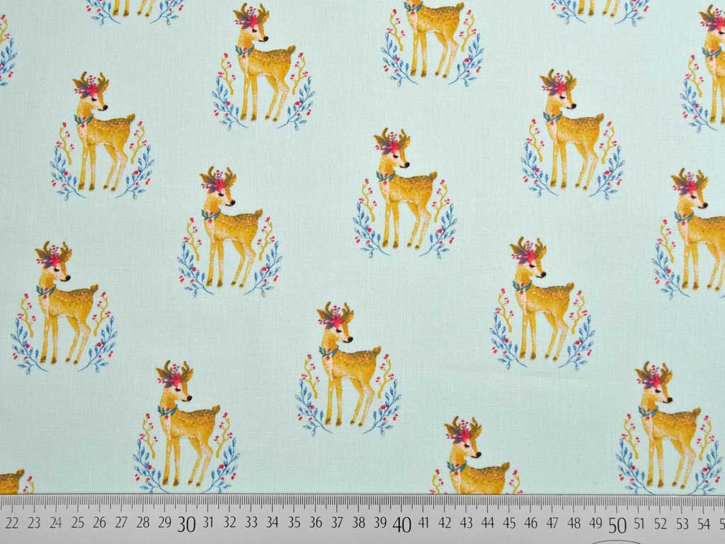 Ein niedlicher Baumwollstoff (Popelin) in mint mit Rehen, die kleine Blumenkränze auf dem Kopf tragen und dunkelblauen Zweigen.