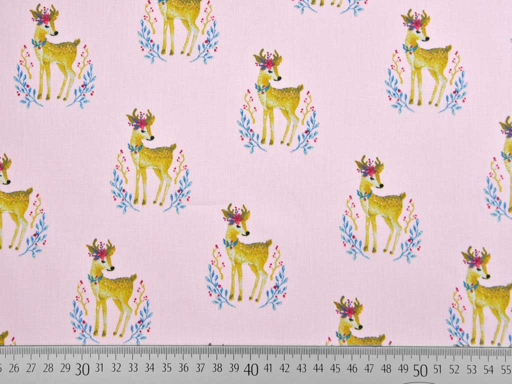 Ein niedlicher Baumwollstoff (Popelin) in rosa mit Rehen, die kleine Blumenkränze auf dem Kopf tragen und dunkelblauen Zweigen.