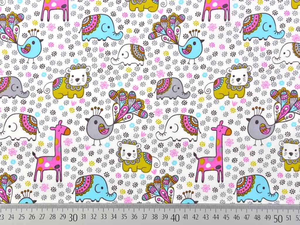 Ein weißer, weicher Baumwollstoff mit bunten Zootieren - hellblauen Elefanten, pinken Giraffen, grauen Vögeln und ocker Löwen. Die Tiere sind mit einem farbenfrohen Mandaladesign geschmückt und sind von kleinen bunten Streublümchen umgeben.