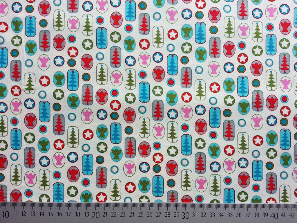Ein cremeweißer Weihnachtsstoff aus Baumwolle aus der Serie Joyful Christmas mit bunten Weihnachstmotiven wie Engeln, Tannenbäumen, Sternen, Kugeln in rot, grün, türkis, blau, rosa und hellgrau. Die Motive sind jeweils eingerahmt und sehen aus wie kleine Bilder.