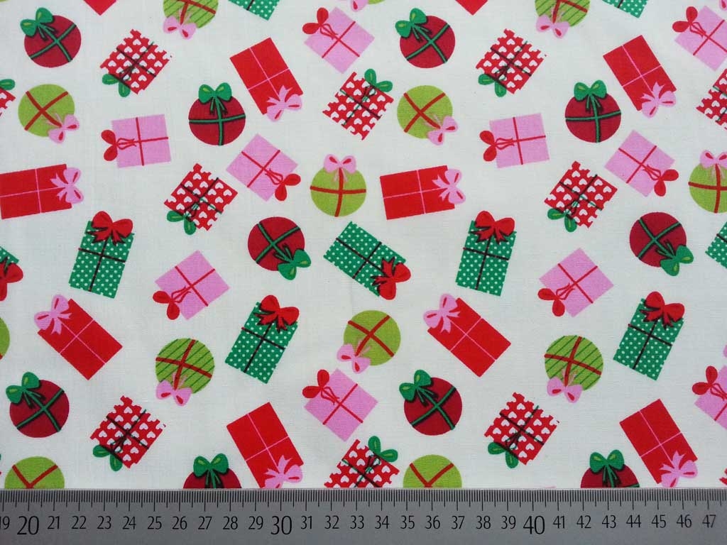 Ein cremeweißer Weihnachtsstoff mit eingepackten bunten Geschenken in rot, grün, hellgrün und rosa. Die Geschenke sind teilweise gepunktet oder mit kleinen Herzen geschmückt.