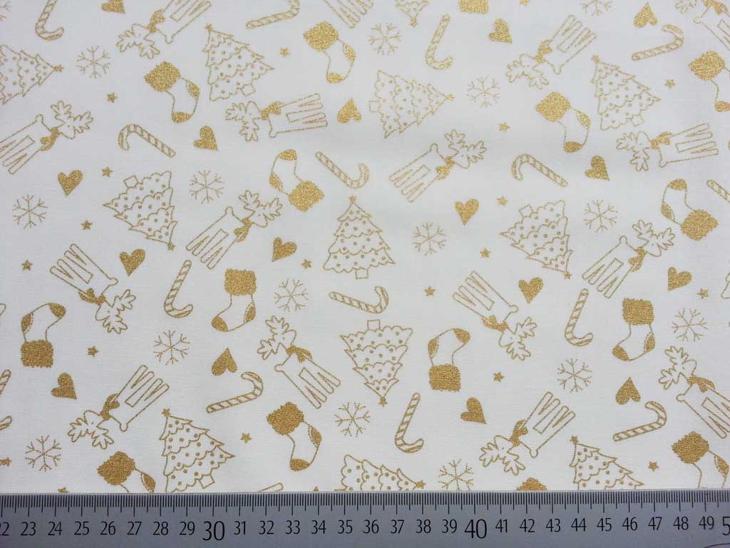 Ein cremeweißer Weihnachtsstoff aus Baumwolle mit goldglitzernden Weihnachtsmotiven wie Weihnachststrumpf, Zuckerstange, Eiskristallen, Weihnachstbäumen, Herzen und Rentieren.