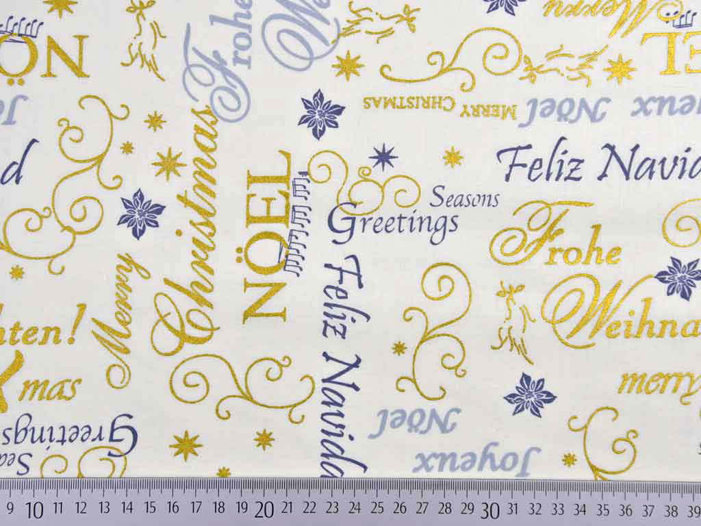Ein cremeweißer Weihnachtsstoff aus Baumwolle mit Weihnachtswünschen in verschiedenen Sprachen in grau und gold metallic.