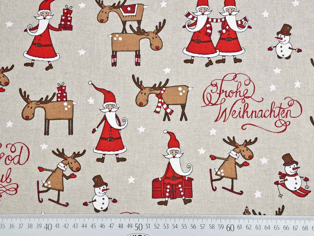 Ein naturfarbener Dekostoff in Leinen-Optik mit weihnachtlichen Elchen, Weihnachtsmännern, dem Aufdruck Frohe Weihnachten, Merry Christmas, etc.